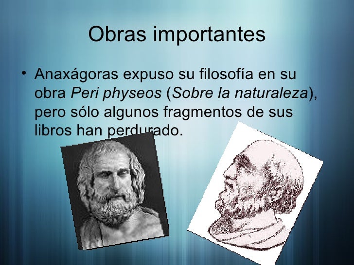 A continuación se presentaran las obras escritas por el filósofo Anaxágoras , en las cuales plasma su pensamiento filosófico sobre la creación de todo lo que existe en el universo.